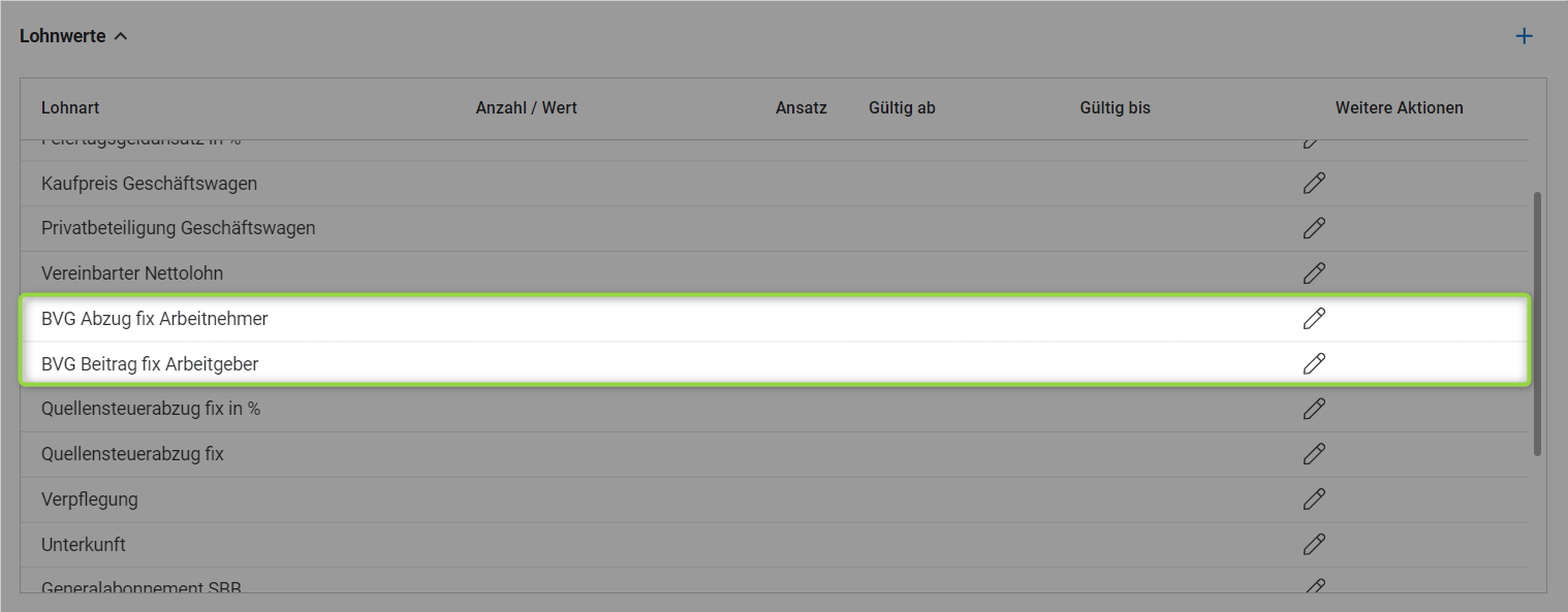 Beachten Sie, dass nur ein BVG-Versicherungsvertrag möglich ist. Wenn Sie gemäss Ihrem Versicherungsvertrag eine obligatorische + überobligatorische Versicherung haben, müssen Sie den Betrag selbst berechnen und manuell in den Lohndaten des Arbeitnehmers eingeben, mit Hilfe der Lohnarten "BVG Abzug fix":
