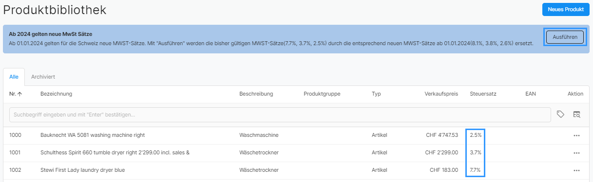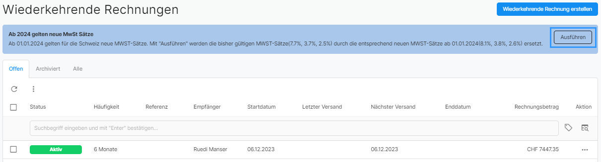 Gibt es Produkte, wiederkehrende Rechnungen oder Vorlagen welche bei den Produkten die bis und mit 31.12.2023 gültigen MWST-Sätze (7.7%, 3.7% und 2.5%) definiert haben, so besteht die optionale Möglichkeit diese MWST-Sätze auf die neuen MWST-Sätze (8.1%, 3.8% und 2.6%) mit Gültigkeit ab 01.01.2024 umzustellen. Wird die Umstellung ausgeführt, so werden alle MWST-Sätze entsprechend ersetzt.