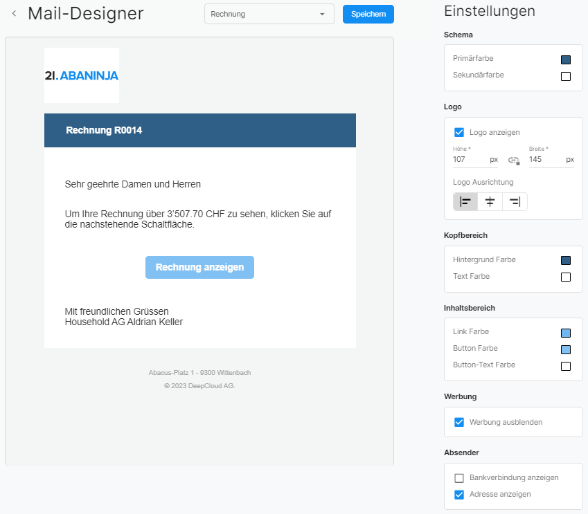 Unter Einstellungen > Kunden > E-Mail-Versand > Mail-Designer können Sie die E-Mail-Vorlage für den Versand von Kundendokumenten anpassen. Neu ist es möglich die E-Mails für die entsprechenden Kundendokumente zu personalisieren.