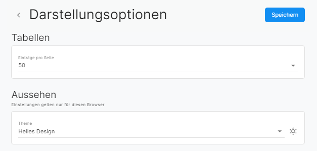 Unter Einstellungen > Allgemein > Darstellungsoptionen kann einerseits die Anzahl Einträge pro Seite für die Listen fix definiert werden, andererseits kann das Gerätedesign angepasst werden.