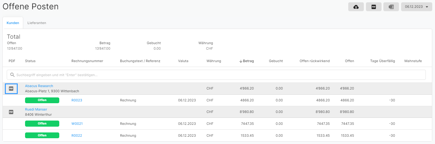 Unter Buchhaltung > Bericht > Offene Posten gibt es eine neue Möglichkeit, um einen PDF Bericht für den jeweiligen Kunden zu erstellen. Mit dem PDF-Icon kann auf einfache Art und Weise ein Kontoauszug mit den offenen Posten pro Kunde erstellt werden.