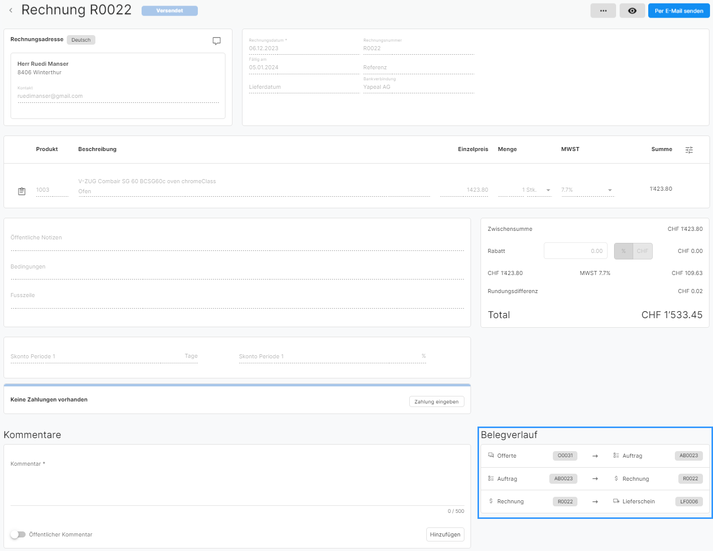 In den Kundendokumenten wie Offerten, Aufträge, Rechnungen usw. wird neu mit einem Belegverlauf aufgezeigt, wie die verschiedenen Kundendokumente zusammenhängen. So ist bspw. auf einen Blick ersichtlich, aus welcher Offerte die entsprechende Rechnung erstellt wurde und ob noch ein Lieferschein oder Auftrag dazugehört.