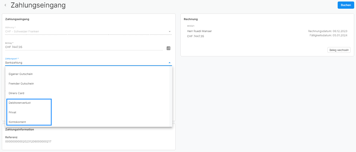 Bei den Zahlungen stehen mit Debitorenverlust, Privat und Kontokorrent drei neue Zahlungsarten zur Verfügung. Unter Einstellungen – Buchhaltung – Kontenvorschläge können für die entsprechenden Zahlungsarten individuelle Kontenvorschläge definiert werden.