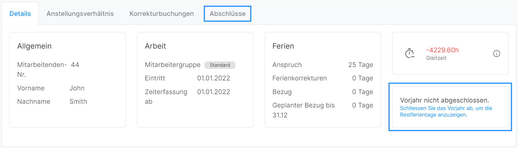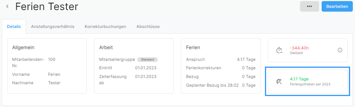 Wird die Ferienzeit nicht angezeigt, muss zuerst das Vorjahr abgeschlossen werden, damit die restliche Ferienzeit aus dem Vorjahr dazugerechnet werden kann.