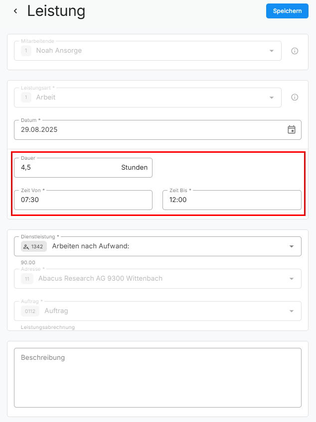 Wenn Sie im Bereich der Leistungserfassung die Zeitangabe oder Dauer ändern, werden die beiden anderen Felder automatisch entsprechend angepasst. Das bedeutet, dass zum Beispiel bei einer Änderung der Stundendauer, die Anfangs- oder Endzeit direkt mitgerechnet und aktualisiert wird und umgekehrt. Diese Verknüpfung erspart Ihnen manuelle Berechnungen und gewährleistet eine konsistente und korrekte Zeit- beziehungsweise Leistungserfassung.