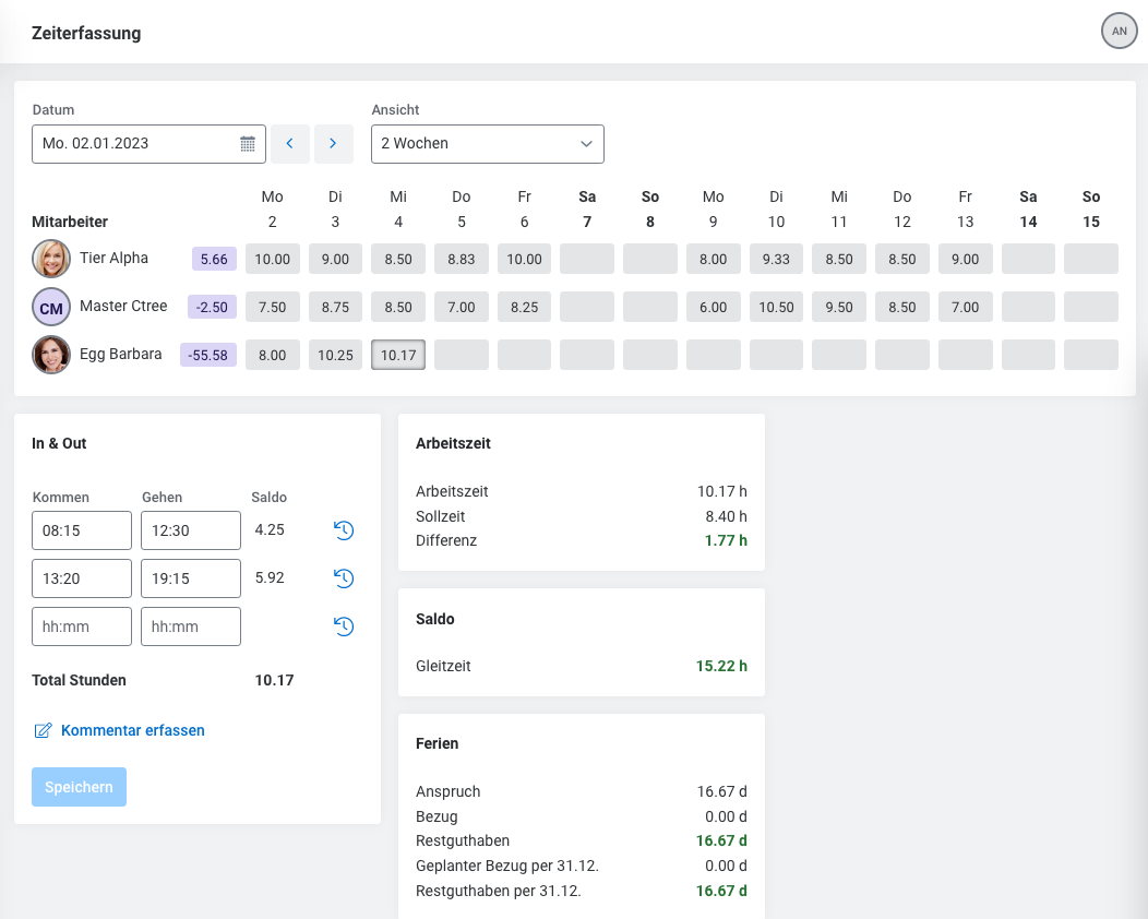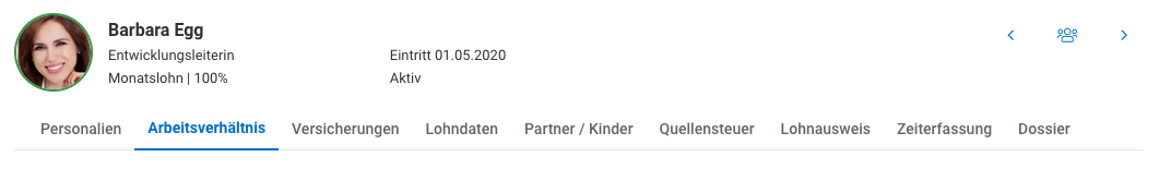 Mit den < > Symbolen rechts oben kann durch die Mitarbeitenden geblättert werden. Die jeweilige Seite bleibt dabei erhalten. Mit dem Personen-Icon zwischen den Pfeilsymbolen gelangt man zur Mitarbeiterübersicht.