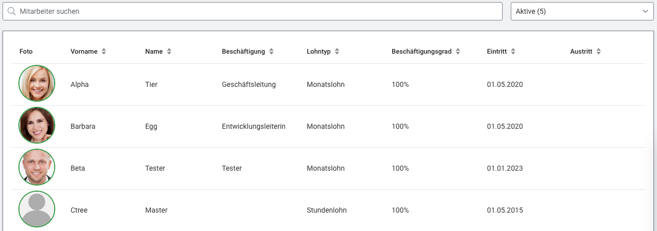 Die Mitarbeiterübersicht zeigt wahlweise die aktiven, inaktiven Mitarbeiter (abhängig von Ein- Austritt). Das Avatar ist bei aktiven Mitarbeiter grün und bei ausgetretenen oder noch nicht eingetretenen Mitarbeiter rot umrahmt. Die frühere Kartendarstellung steht nicht mehr zur Verfügung.