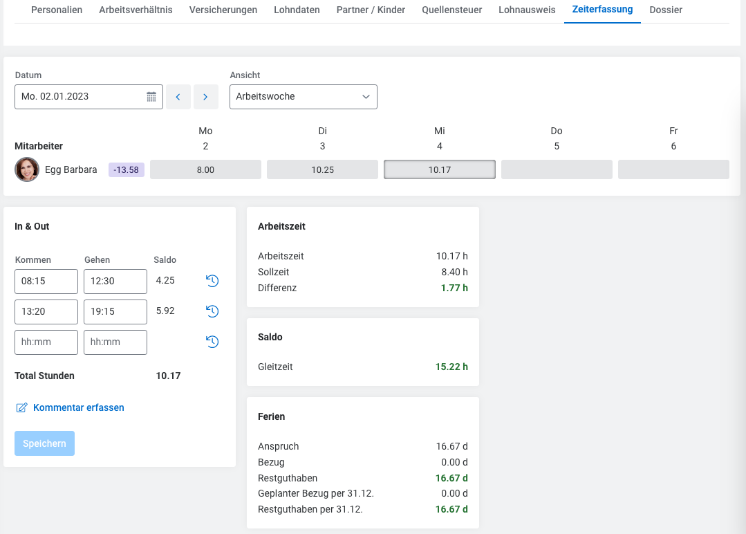Anhand der Sollstunden und den auf den Mitarbeitenden protokollierten Arbeitszeiten wird ein täglicher Gleitzeitsaldo ermittelt. Bei Mitarbeitenden mit einem Beschäftigungsgrad unter 100% werden die Sollstunden pro Rata angewendet.