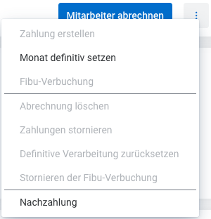 An den verfügbaren Aktionen haben sich keine Änderungen ergeben. Einzig die "Nachzahlung" wurde in die erweiterten Aktionen aufgenommen. Die Aktion war in der früheren Version etwas zu sehr versteckt und führte zu Supportanfragen. Nachzahlungen sind ausschliesslich für bereits ausgetretene Mitarbeiter möglich und dienen dazu, beispielsweise vergessene Zulagen im Nachhinein auszuzahlen.