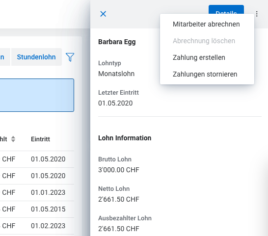 Beim Klick auf eine Zeile / Person öffnet sich am rechten Rand ein Sidepanel. Über den blauen Button sowie das Dreipunktemenü daneben lassen sich verschiedene Aktionen ausführen. Diese beziehen sich immer auf die jeweils angewählte Person. Bei abgerechneten Mitarbeiter gelangt man mit Klick auf "Details" in die Abrechnungsdetails.