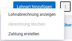 Weiterhin besteht die Möglichkeit direkt aus den Abrechnungsetails die PDF-Lohnabrechnung anzuzeigen oder eine Einzelzahlung für die gerade bearbeitete Person zu erstellen. Die entsprechenden Aktionen sind neu oben rechts über das Dreipunktemenü zu finden.