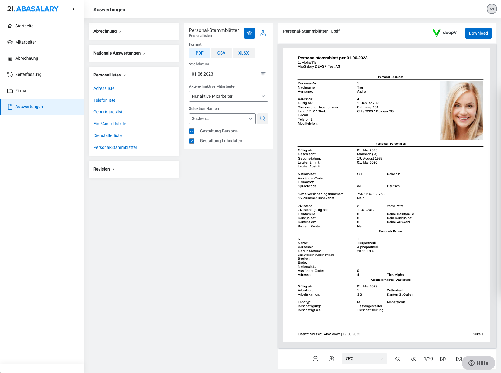 Zeigt auf einen Blick Funktion, Lohntyp, Beschäftigungsgrad und Ein- / Austrittsdatum. Das Mitarbeiterbild lässt sich nun mit einem Klick auf das Avatar einfügen oder ersetzen.