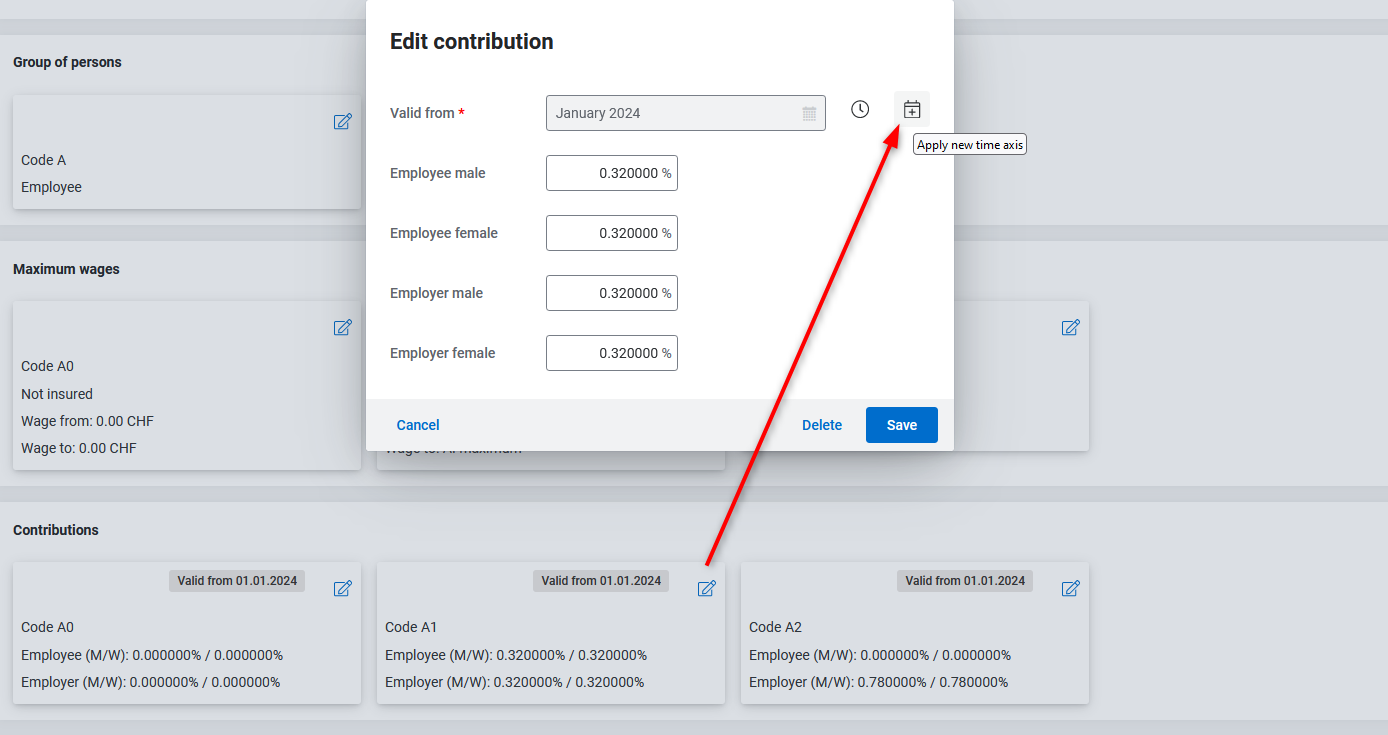 The insurance rate or code, e.g. for UVG or KTG, can be changed at any time using a timeline. This means that the change can take place from the beginning of a month or a year