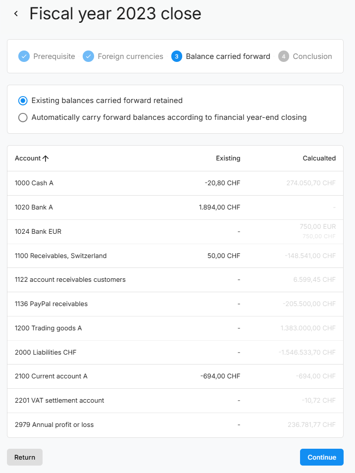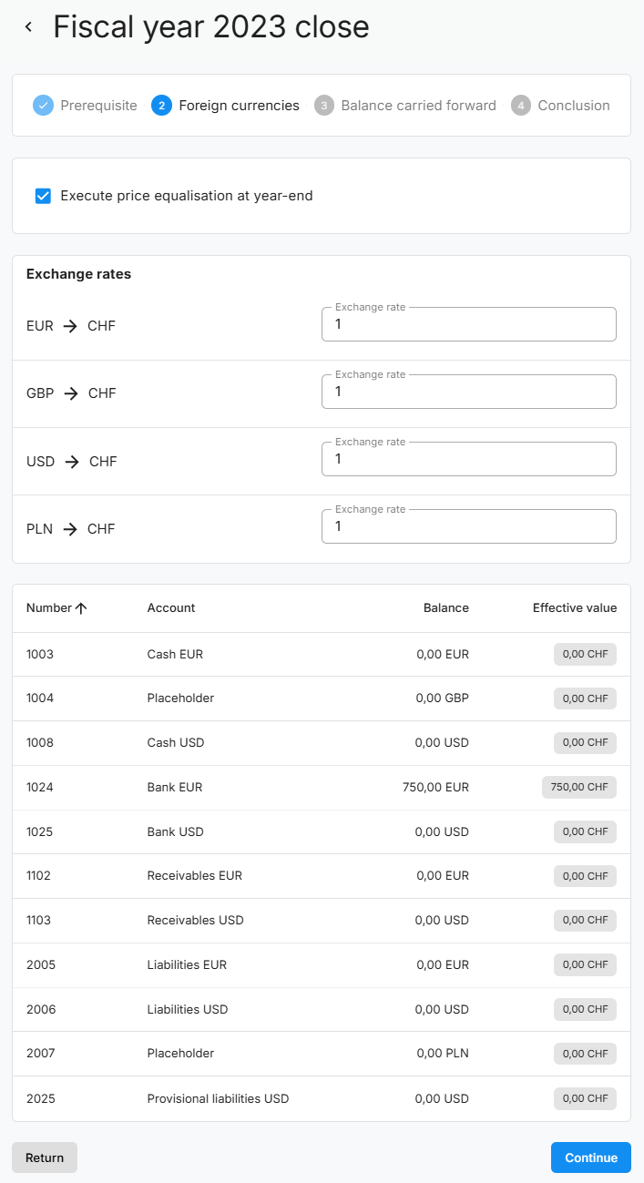 In the “Foreign currencies” step, you can choose whether to perform a currency adjustment directly at the end of the fiscal year – and you can adjust or adopt the exchange rates yourself.