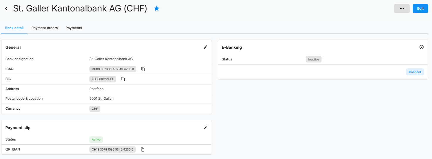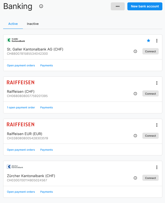 The new display shows all active and inactive bank accounts at a glance. Each account is displayed with important details such as the name (logo) of the bank, the IBAN, the currency and the status of the e-banking connection. Open payment orders and executed payments can be viewed and managed directly for each individual account.