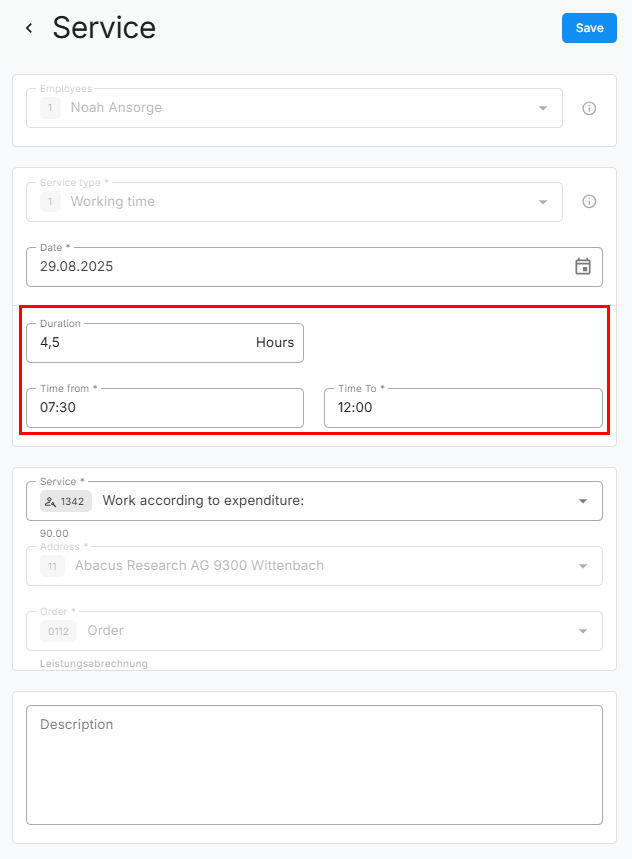 If you change the time or duration in the performance recording area, the other two fields are automatically adjusted accordingly. This means that, for example, if you change the number of hours, the start or end time is calculated and updated directly, and vice versa. This link saves you manual calculations and ensures consistent and correct time and performance recording.
