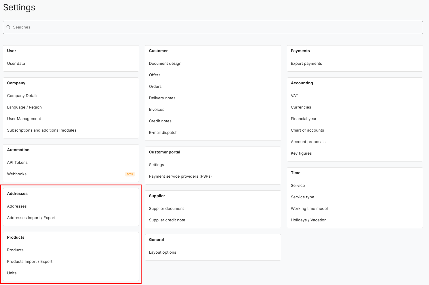Direct links to the respective settings have been added in the areas of addresses, customer documents, supplier documents, products, time recording and accounting.