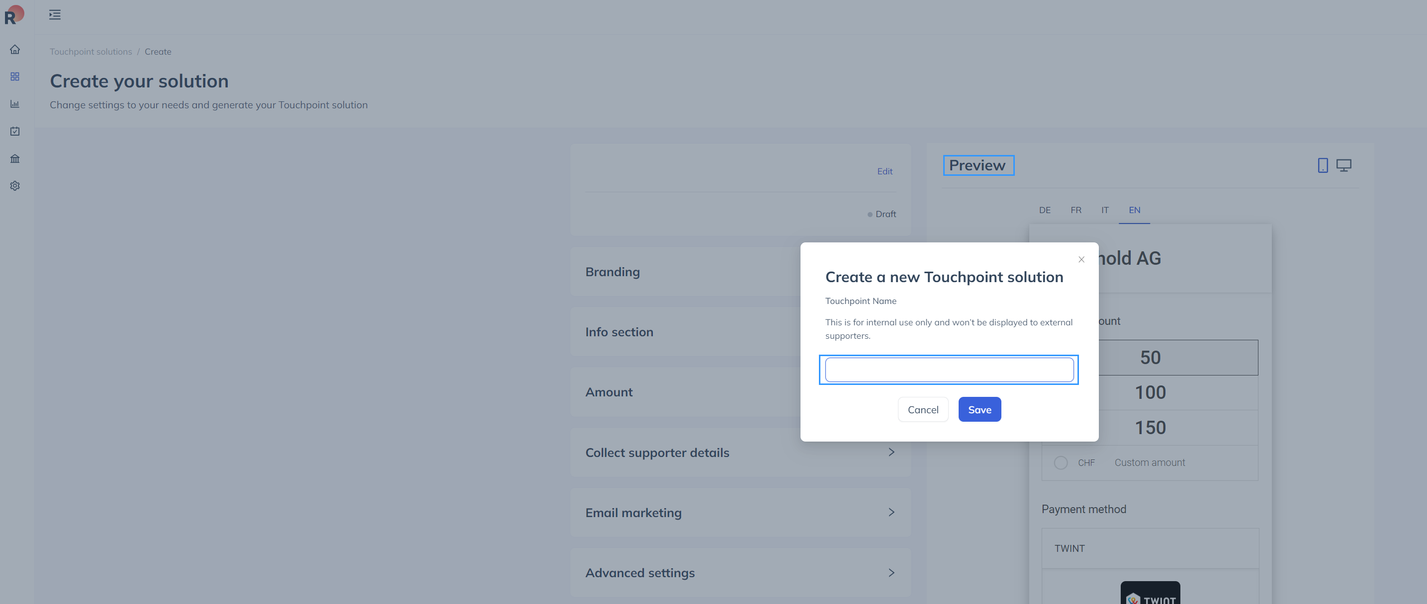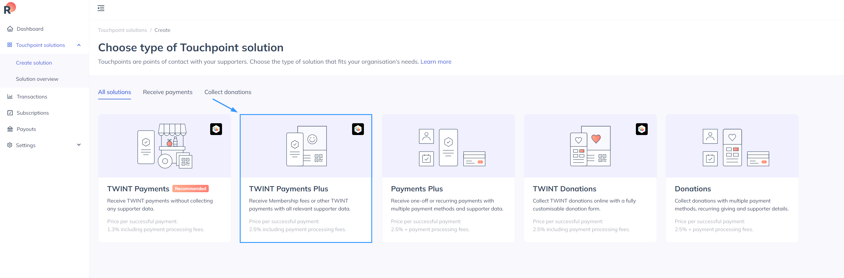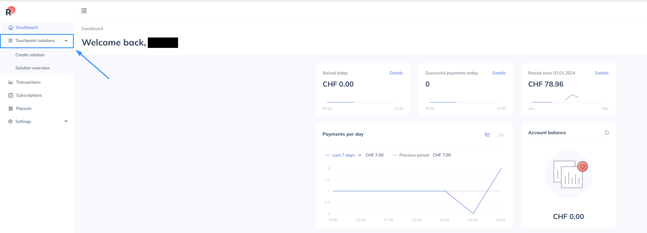 - Log in to RaiseNow and you will be taken to the dashboard. Click on Touchpoint Solutions in the menu on the left:
