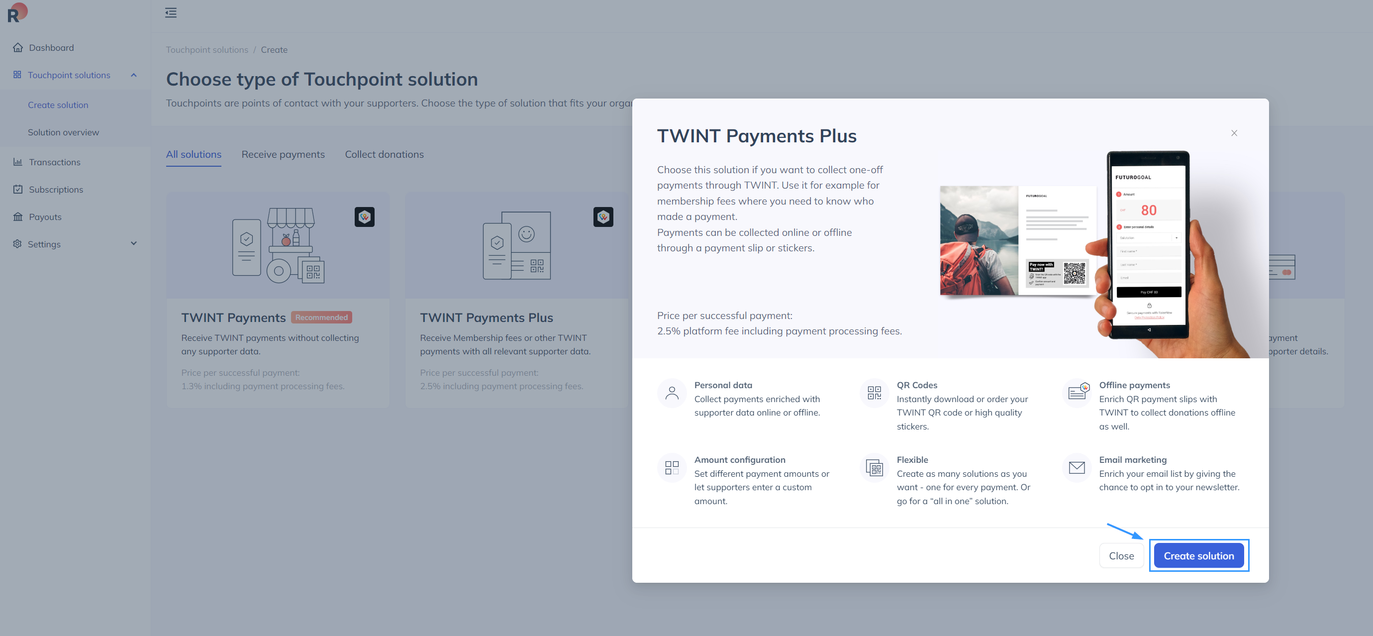 - Select the QR code of the type Receive payments incl. personal data (TWINT Payments Plus):
