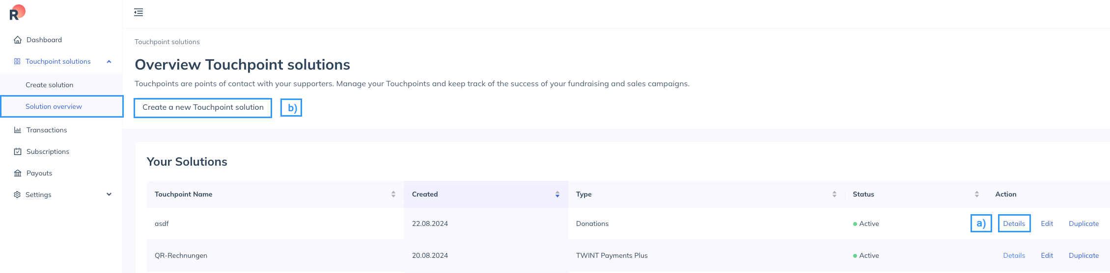a) Either click on Details for an existing QR code of the type Payments incl. details on the right