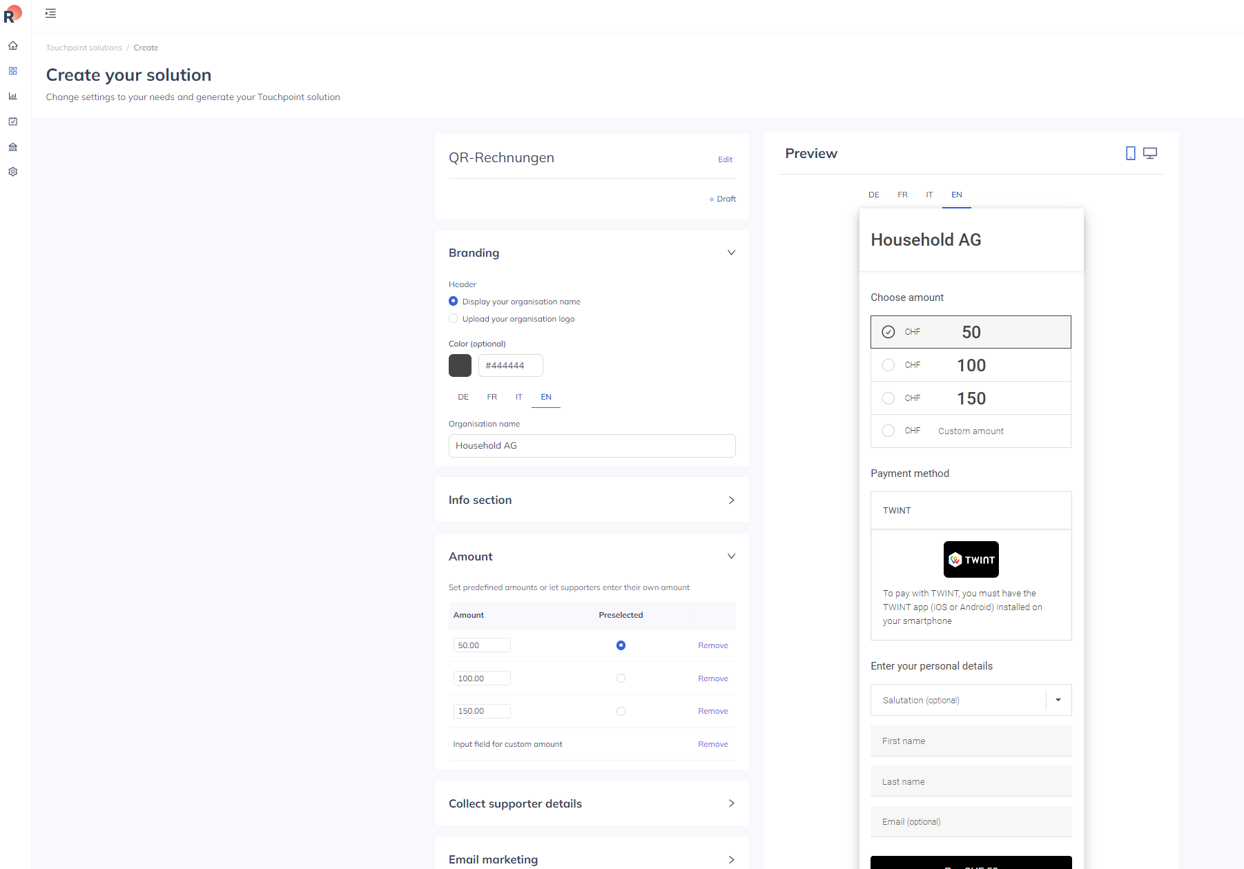 - Give the code a name. No special settings need to be made. However, the design can be customised. The right-hand area shows what is displayed to the customer after scanning the QR invoice. (The amount is filled in automatically):