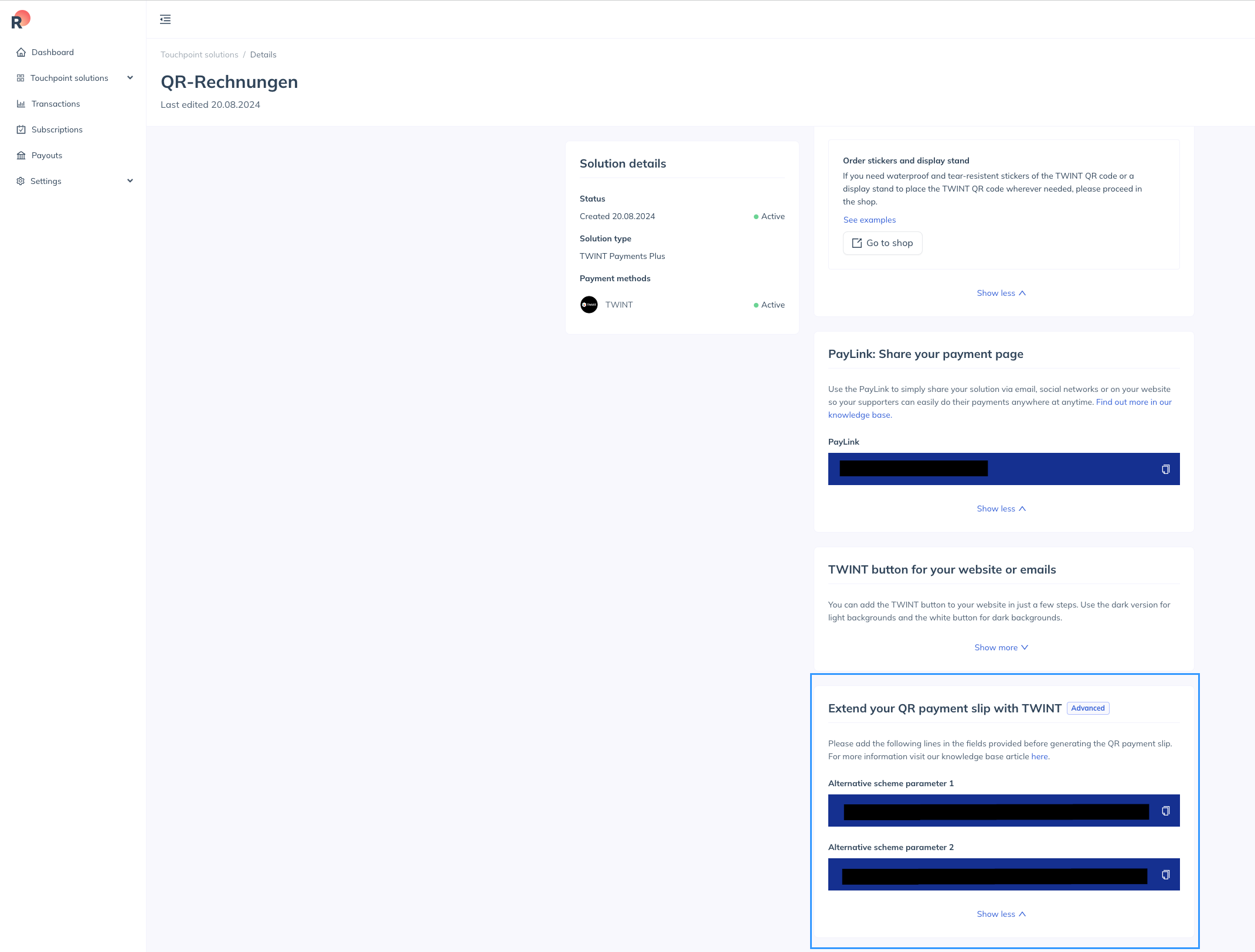 - In the section Expand your QR deposit slip with TWINT, click on Show options and copy the two Alternatives procedure parameters: