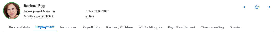 The < > symbols at the top right can be used to scroll through the employees. The respective page is retained. The person icon between the arrow symbols takes you to the staff overview.