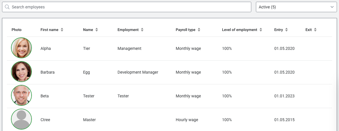 The employee overview shows either the active or inactive employees (depending on whether they have joined or left). The avatar is framed in green for active employees and in red for employees who have left or not yet joined. The former card display is no longer available.