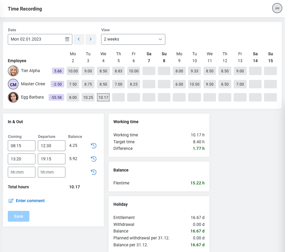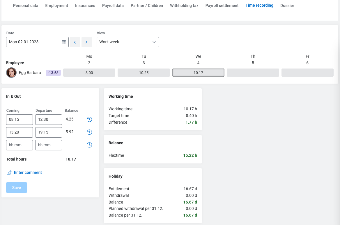 New view "Time recording". Shows the time and holiday balances of an employee at the selected key date. The time worked is logged by means of clocking in and clocking out. Provided that target hours have been defined (under Company - Configuration Time Recording), the current flextime balance is automatically determined.