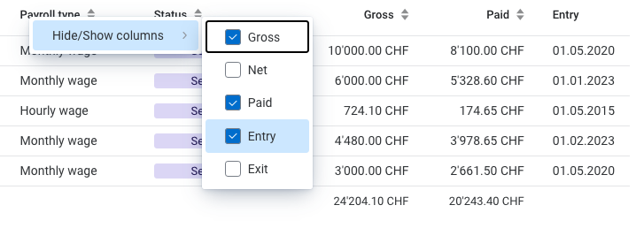 With a right click, columns can be hidden or shown in the settlement overview. The column width can be adjusted with the mouse. Amount columns show a total at the bottom. These also react to selections (wage type or individual selections). As in previous versions, the amounts in the panel on the right (payroll information) always show the values for the entire month - regardless of selections.