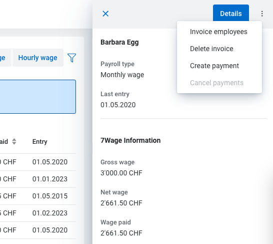 Clicking on a row / person opens a side panel on the right edge. Various actions can be carried out via the blue button and the three-point menu next to it. These always refer to the selected person. Clicking on "Details" takes you to the payroll details for employees who have been paid.