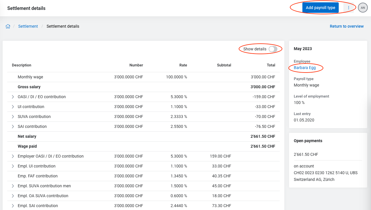 The payroll details show the wage types contained in the payroll as before. Details can now be shown or hidden via a button. By clicking on a line, a wage type (payroll type)can be adjusted or deleted, provided that the wage type allows editing.