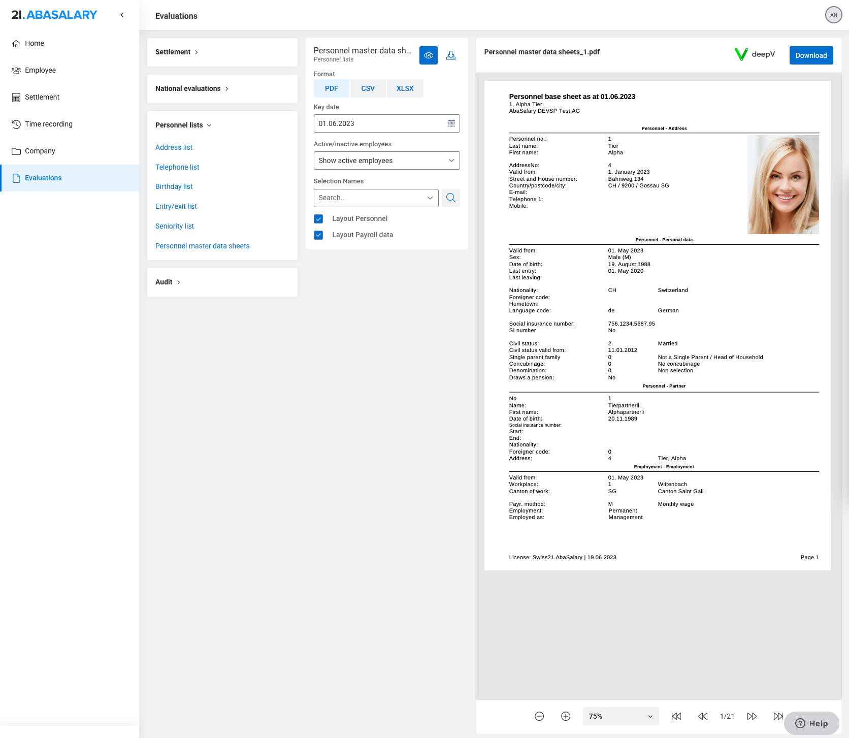 Displays function, wage type, employment level and entry/exit date at a glance. The employee picture can now be inserted or replaced with a click on the avatar.