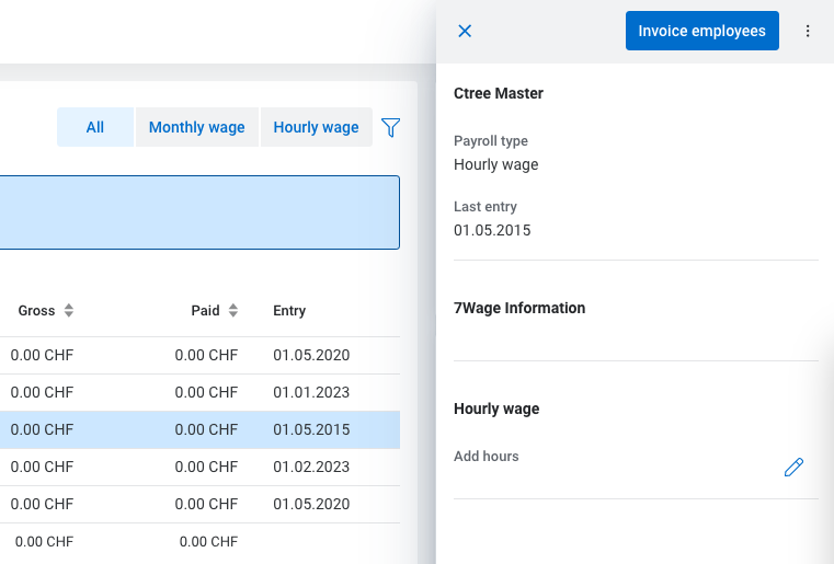Additional wage types are added to the payroll via the blue button in the top right-hand corner.