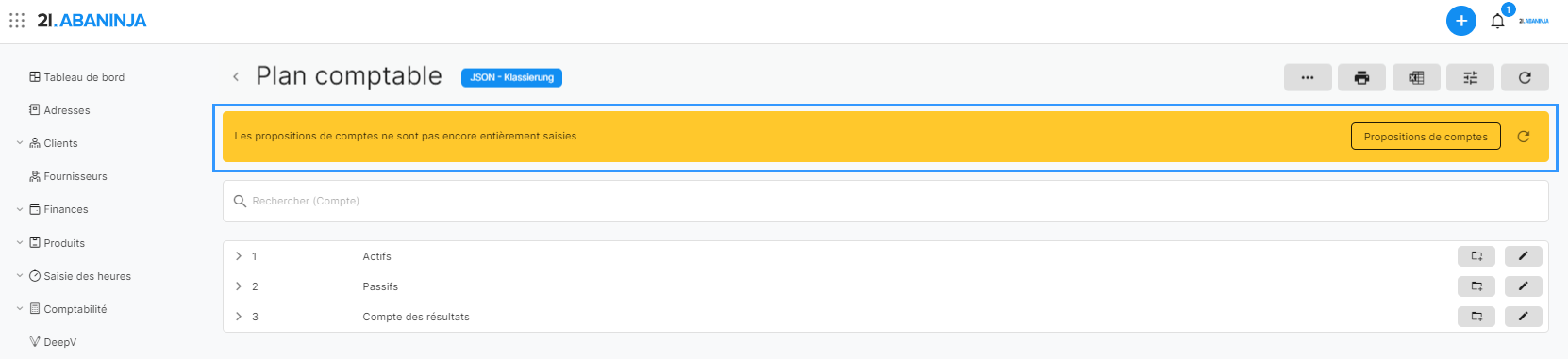 Lors d'une importation, les propositions de comptes sont également supprimées et doivent être à nouveau générées ou saisies. Vous ne pourrez travailler avec AbaNinja que lorsque toutes les propositions de comptes seront définies.