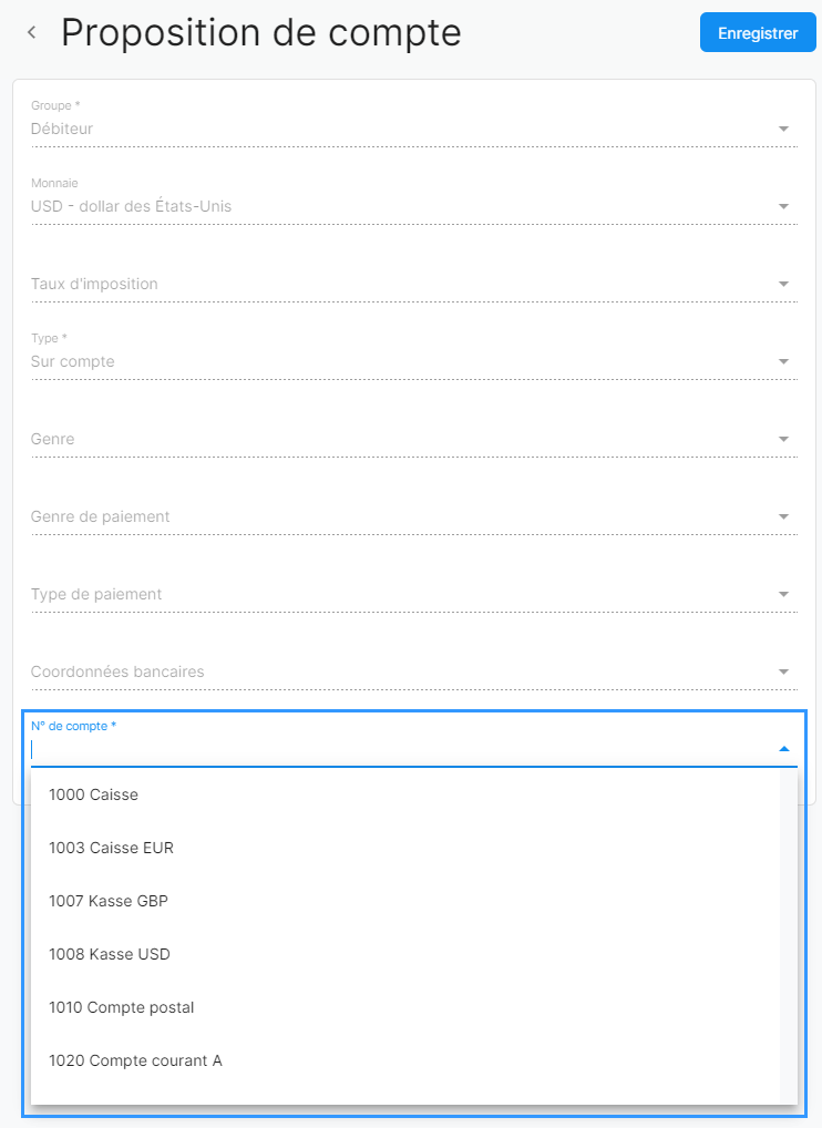 Les propositions de comptes incomplètes doivent être saisies manuellement. Pour cela, la proposition de compte correspondante doit être sélectionnée et enregistrée avec le compte que vous souhaitez.