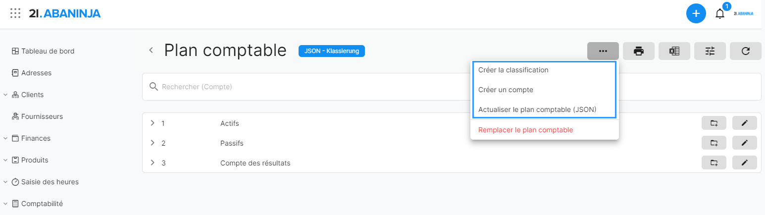 Si un plan comptable a été importé au format JSON, il peut être mis à jour avec un autre plan comptable JSON. Pour cela, il faut actualiser le plan comptable dans AbaNinja sous Paramètres > Comptabilité > Plan comptable via le menu d'action.