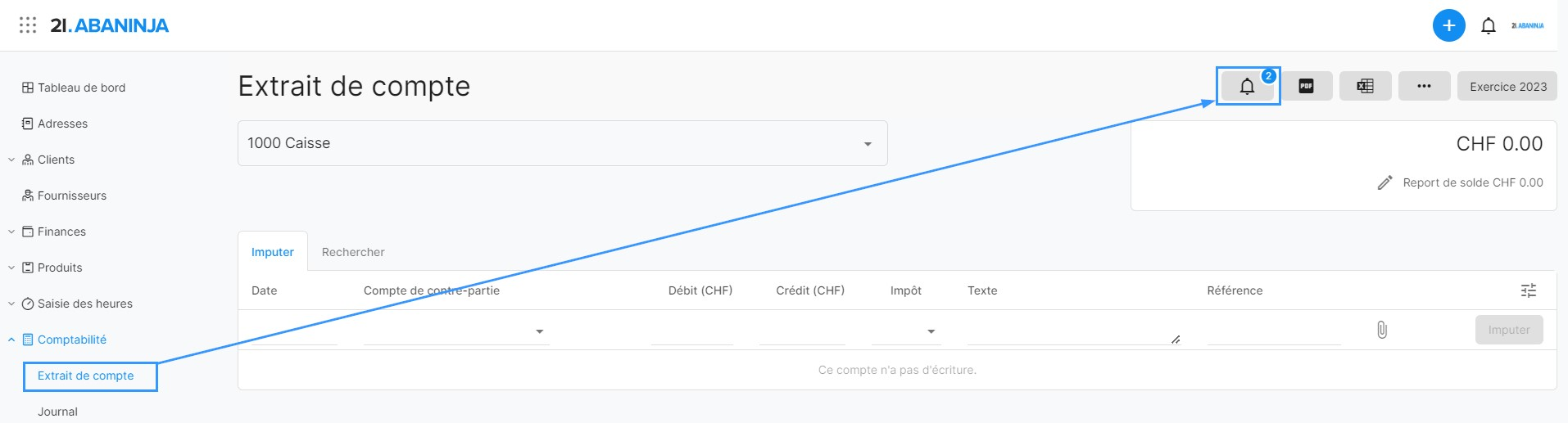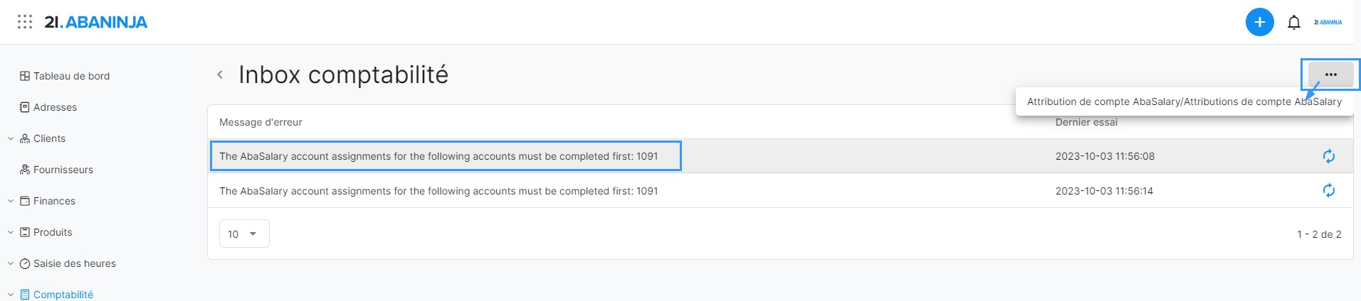 Si la comptabilisation est effectuée depuis AbaSalary et que le système reconnaît que certains comptes n'existent pas dans AbaNinja, l'imputation ne peut pas être effectuée et une inbox comptabilité est affichée dans l'extrait de compte.