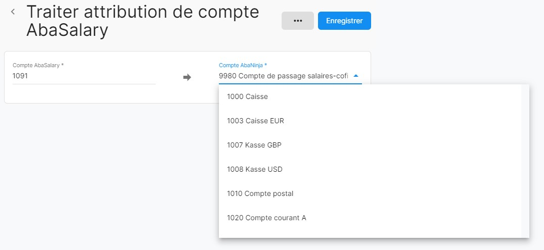 Cette fonction peut également être activée sous Paramètres > Comptabilité > Attribution de compte AbaSalary. Vous pouvez ensuite définir à quels comptes dans AbaNinja les écritures AbaSalary correspondantes doivent être attribuées.