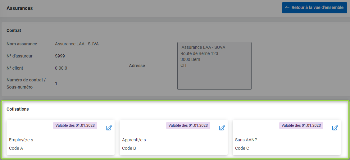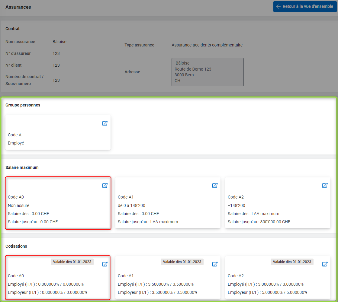 Dans l'assurance LAA, vous pouvez créer différents groupes de personnes avec des taux différents. Dans l'exemple ci-dessous, nous avons paramétré l'assurance LAA avec un Code A pour les employé/e-s standards, un code B pour les apprenti/e-s et un code C pour les employés sans cotisations (moins de 8h par semaine).