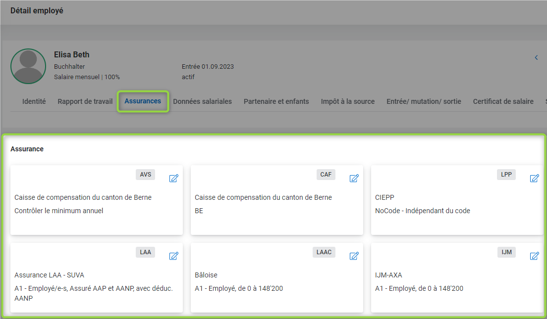 Si un employé doit être affilié à une assurance autre que celle standardisée auparavant ou si sa situation vis-à-vis de l'assurance change en cours d'année, vous pouvez à tout moment éditer les assurances personnalisées dans la fiche de l'employé concerné, sous la rubrique "Assurances":