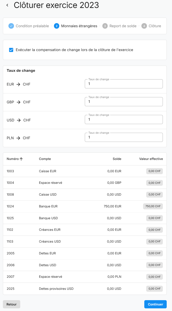 À l'étape « Devises étrangères », vous pouvez choisir d'effectuer un ajustement du cours directement lors de la clôture de l'exercice et vous pouvez ajuster ou reprendre vous-même les taux de change.