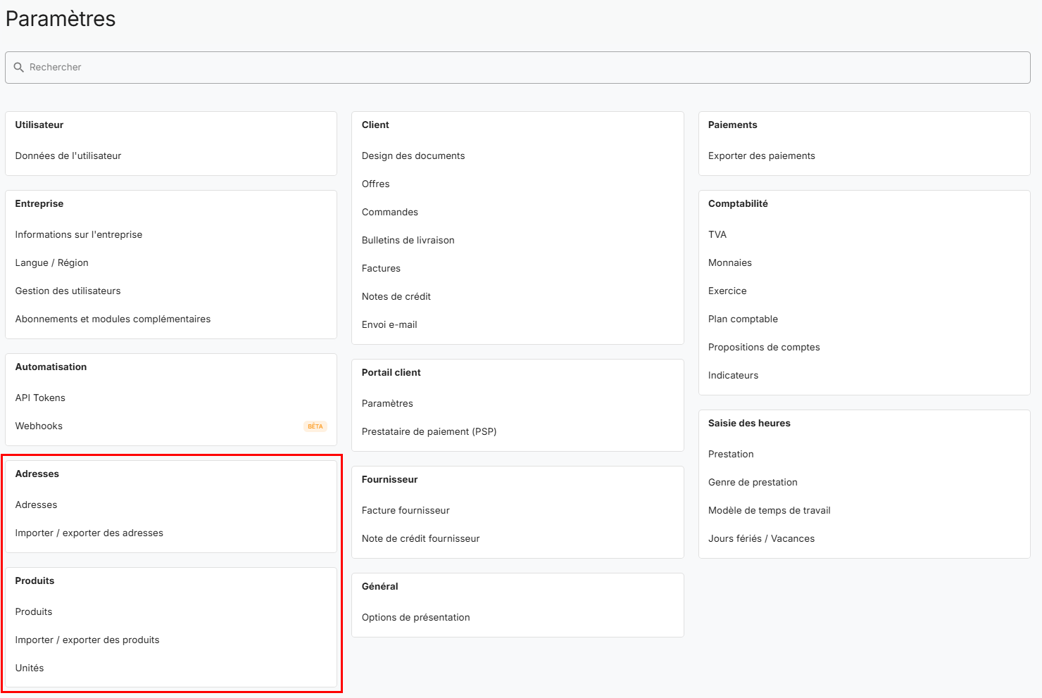Dans les sections Adresses, Documents clients, Documents fournisseurs, Produits, Saisie des temps et Comptabilité, des liens directs vers les paramètres correspondants ont été ajoutés.