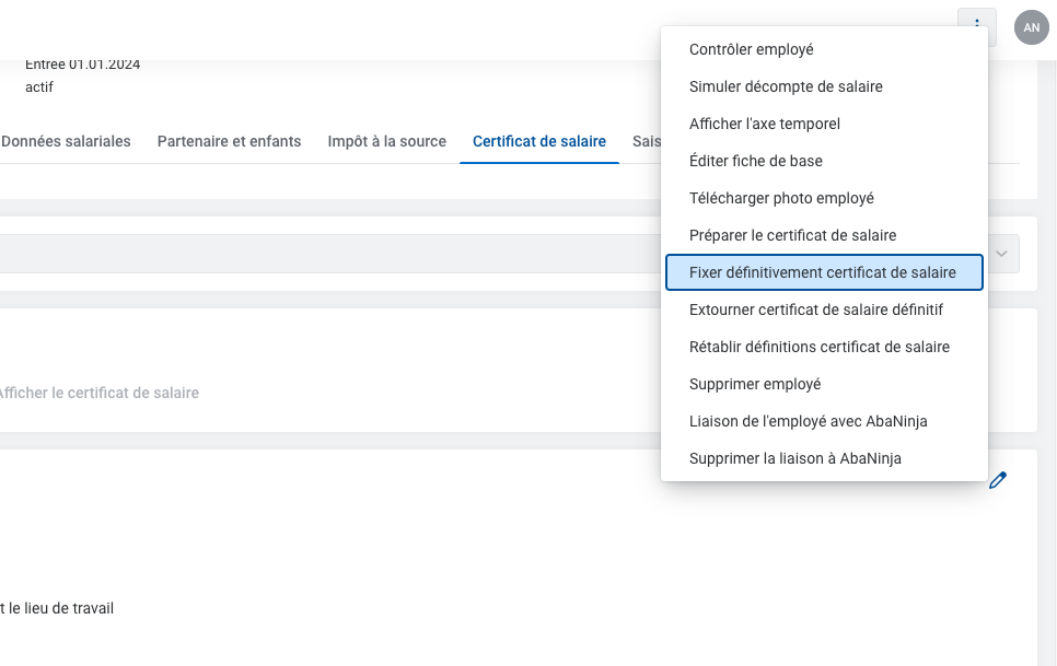 Le même problème se pose lors de l'annulation. Si vous souhaitez annuler le certificats de salaire d'un employé qui a quitté l'entreprise, vous devez également le faire manuellement via le personnel.