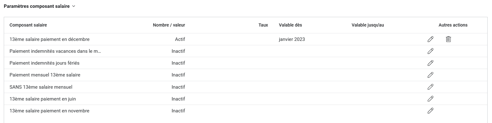 Le 13ème salaire est versé en novembre. La part pour le mois de décembre est déjà prise en compte (sur la base du salaire de novembre). Si le salaire change le mois suivant, une correction est automatiquement calculée en décembre sur le 13ème salaire.