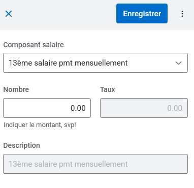 L'utilité de cette fonction est de verser la part du 13ème mois de salaire chaque mois. Ce type devrait être activé exclusivement pour les salaires horaires en cas d'emploi irrégulier.
