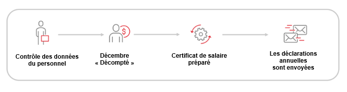 Lors du traitement de fin d'année, les déclarations annuelles de la masse salariale pour l'AVS, l'AC, la CAF, la LAA, la LAAC et l'IJM sont envoyées à l'assurance. En outre, les certificats de salaire peuvent être transmis aux cantons avec obligation de communiquer les salaires (BE, BS, FR, JU, LU, NE, SO, VD, VS).