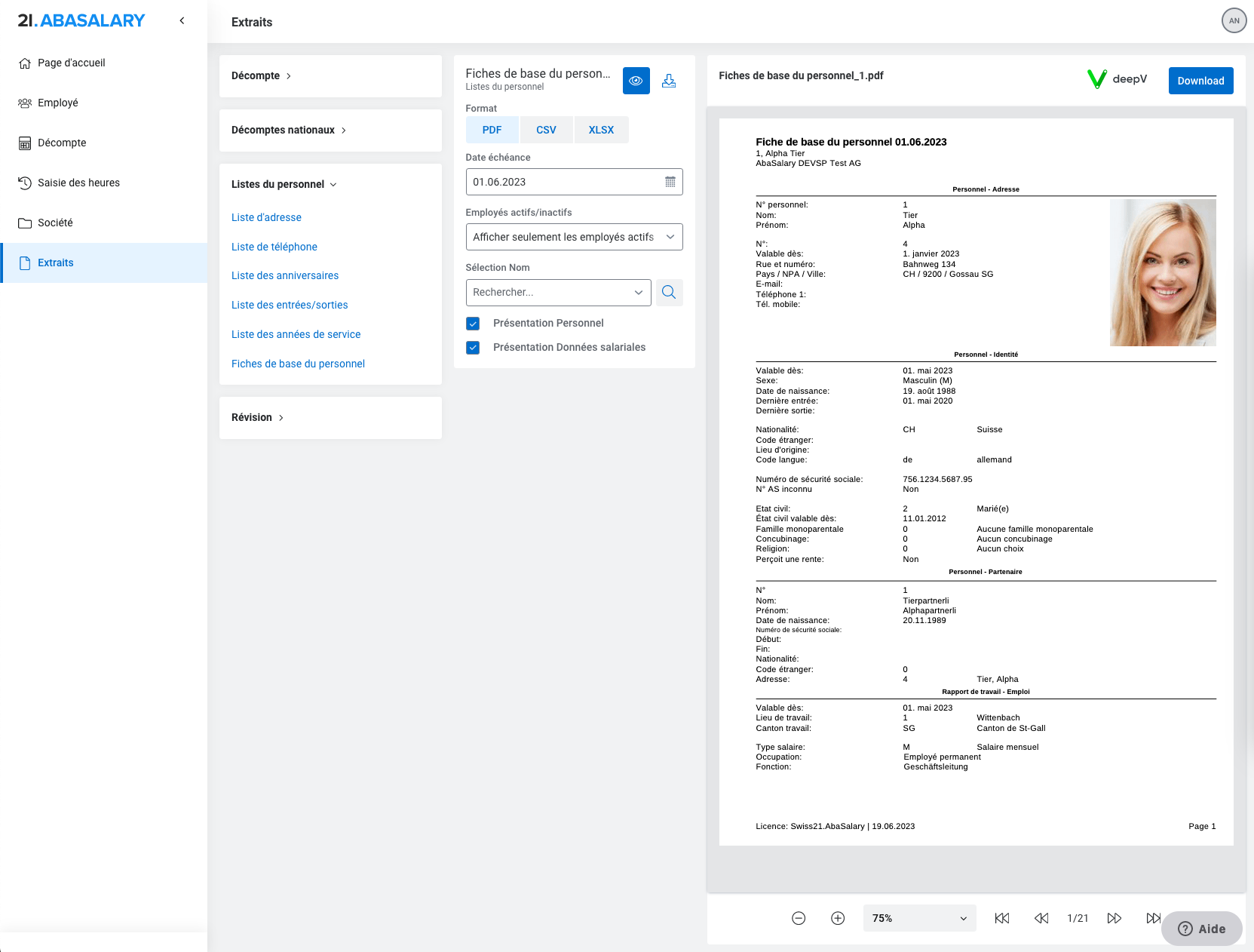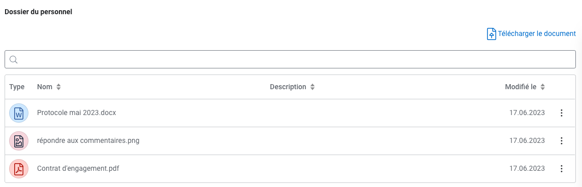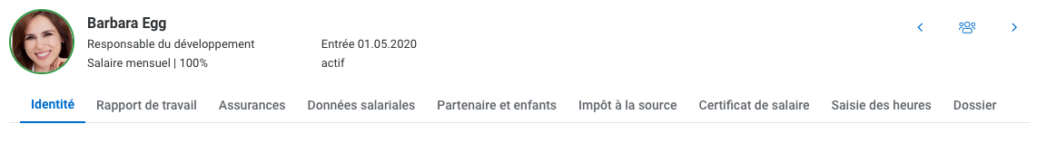 Donne une vue d'ensemble sur la fonction, le type de salaire, le taux d'occupation et la date d'entrée / de sortie. La photo de l'employé peut être ajoutée ou modifiée en cliquant sur l'avatar.