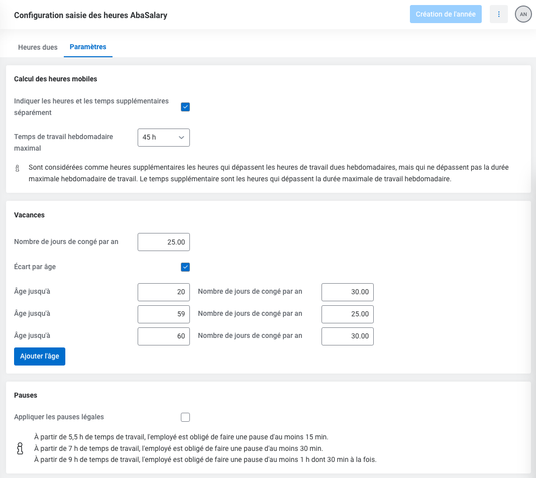 De plus, le droit fondamental aux vacances peut être défini soit pour tous les employés, soit en fonction du groupe d'âges. La gestion des vacances et des absences sera toutefois disponible lors de prochaines mises à jour.