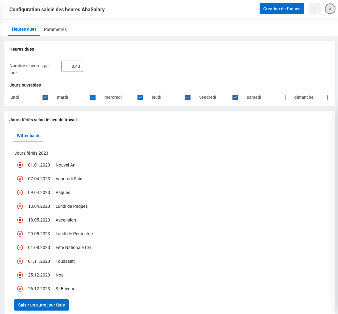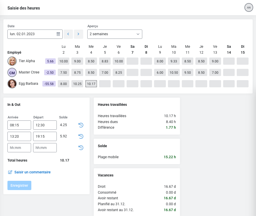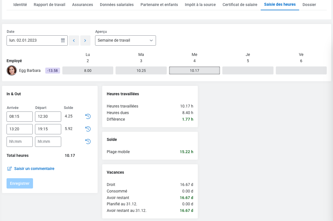 D'autres fonctions (vacances, reprise dans le décompte, saisie du côté de l'employé etc.) seront disponibles dans les mises à jour à venir.